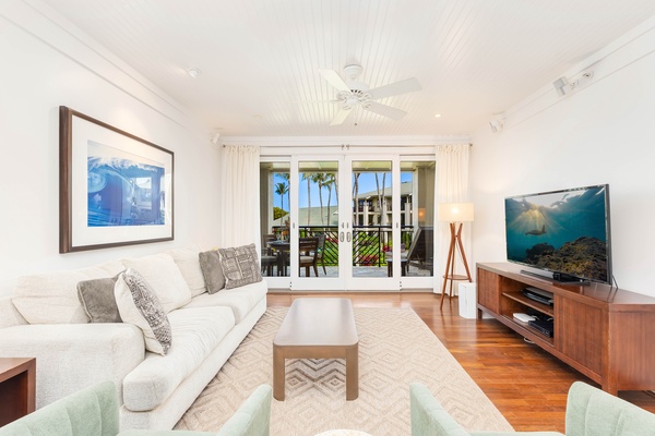 Unwind in your bright living room featuring plush seating and tropical views from your lanai..