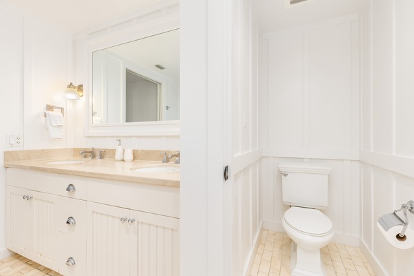 Refresh in your pristine white bathroom with elegant marble counters and crisp coastal-style cabinetry that creates a spa-like retreat.