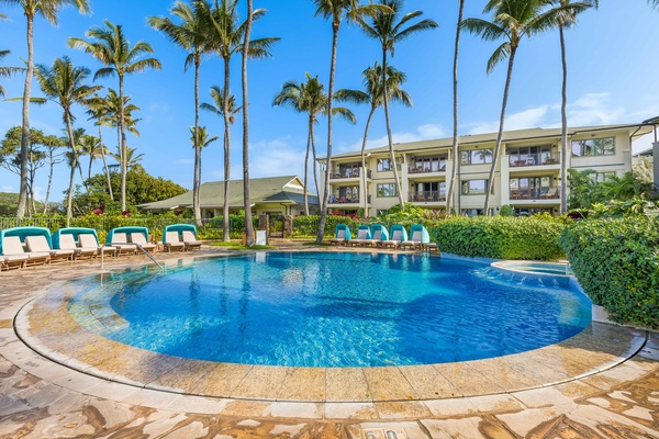 Tropical paradise awaits with crystal-clear pool waters, comfortable loungers, and swaying palms creating your perfect Hawaiian escape.