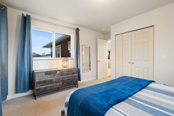 Rest easy in your bright bedroom with coastal blue touches, plenty of storage, and peaceful neighborhood views through your window.