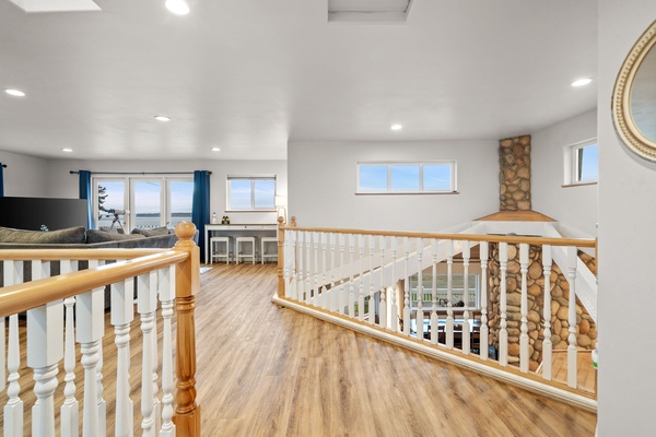 Your upstairs loft offers bright, airy space with wood railings and ocean glimpses through multiple windows.