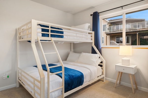 Drift off in your cozy bunk bed with crisp linens and ocean-blue accents, perfect for peaceful nights in this bright, airy room.