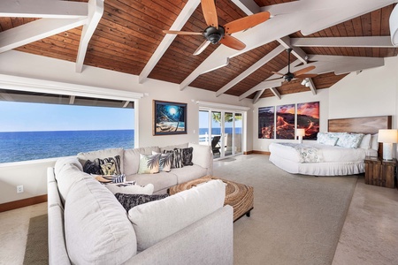 Primary bedroom with King bed, AC, TV, lounge area and ocean views