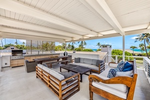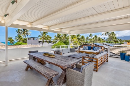 Rooftop deck with built-in BBQ, lounge, and dining spaces with peekaboo ocean views.
