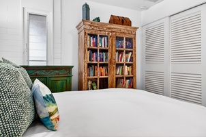 Sink into crisp white linens and let natural light brighten your mornings in this serene bedroom with curated books at your bedside.