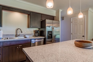 Contemporary kitchen features pendant lighting, stainless steel appliances, and plenty of space to cook and gather.