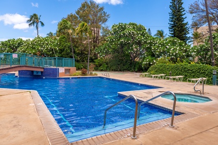 Enjoy a dip in the large community pool surrounded by palm trees and tropical blooms.
