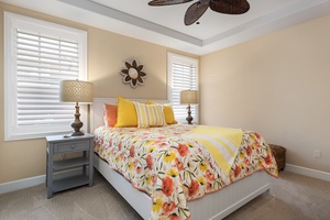 Second guest bedroom with queen bed, ceiling fan, and bright corner windows.