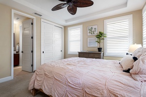 Primary suite with king bed, ceiling fan, and sliding doors to golf course views.