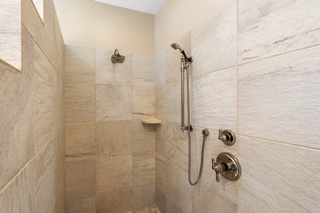 Spacious tiled shower in the primary bathroom with handheld and wall shower heads.