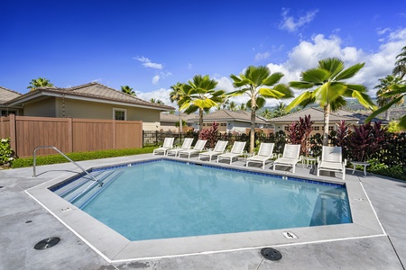 Holua Kai community pool surrounded by palm trees and lounge seating.