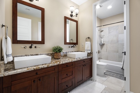 Guest bathroom with double vanity, granite counters, and shower tub combination.