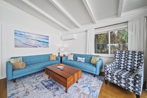 Comfortable seating area accented with coastal artwork, perfect for unwinding after exploring Haleiwa’s beaches and cafés.
