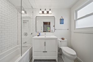 Crisp, newly updated shower with subway tile and clean finishes, offering a spa-like feel for guests.