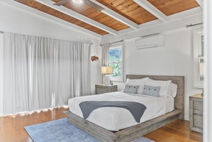 Guest bedroom with a queen bed and cooling A/C—an airy retreat after exploring Haleiwa’s beaches and shops.