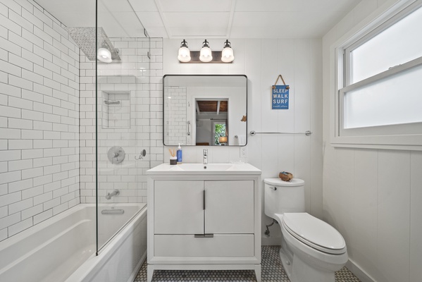 Freshly updated bathroom featuring modern fixtures, spacious vanity, and a walk-in shower for easy post-beach refreshes. Sofa opens to queen bed