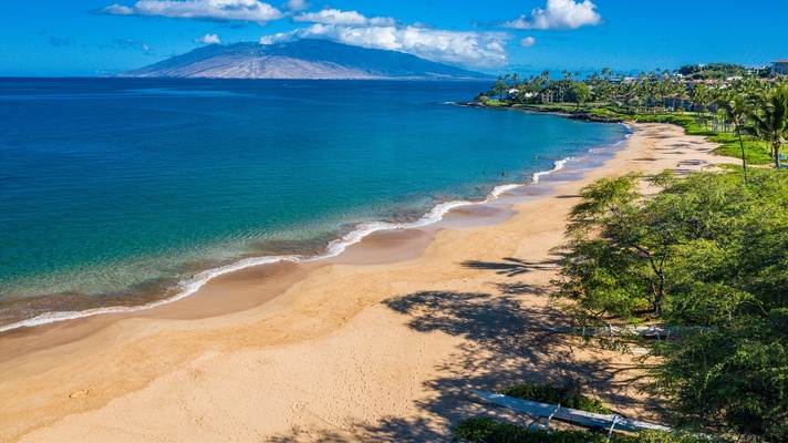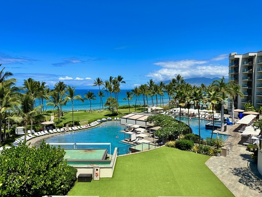 Andaz Maui at Wailea Resort is a sublime tropical eden situated directly on golden Mokapu Beach. With a west-facing location, guests will bask in an abundance of sunshine. Blazing sunsets color the early evening sky, and brilliant moonsets illuminate the deep blue Pacific until late into the evening. Enjoy full panoramic ocean views from this 2nd floor setting. Hang out on the beach for a spectacular show of sparkling stars at night. Enjoy a low density, low rise resort where waterfalls, tiki torches, and beautiful blooming flowers and verdant green fauna decorate your surroundings. The expansive swimming pools are a first for Maui. The flowing water begins its journey at the entry lounge, then gently cascades down through sloping terrain until it gently ponds in the large pool directly in front of Villa 803 and just above Mokapu Beach.