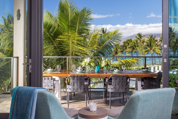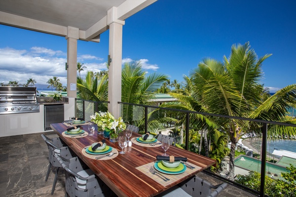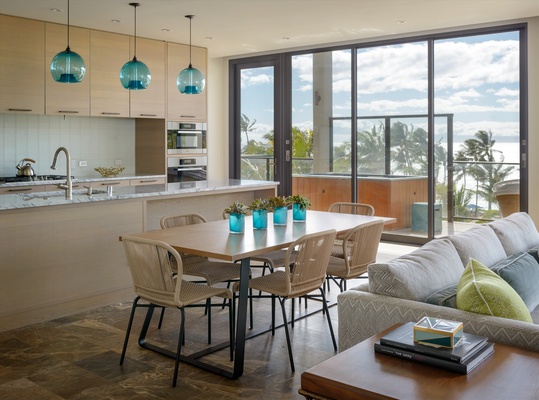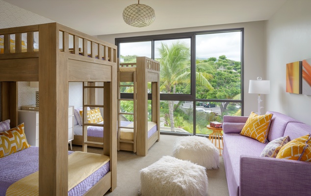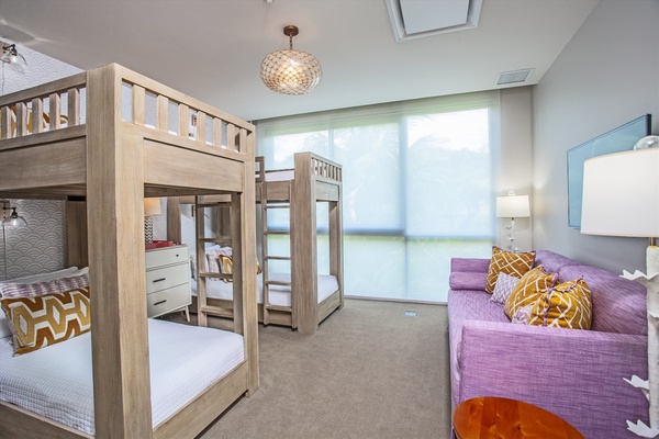 The generously-sized bedrooms accommodate up to 8 guests comfortably with a King bed in the ocean view master and 2nd bedrooms, and 4 extra-long twin bunk beds in the 3rd bedroom. Additional full bathrooms and a powder room provide ample space for everyone. A tranquil night’s sleep becomes an experience to look forward to with plush pillow-top mattresses, luxury cotton bedding, and tropical-themed toiletries in refillable eco-friendly bottles.