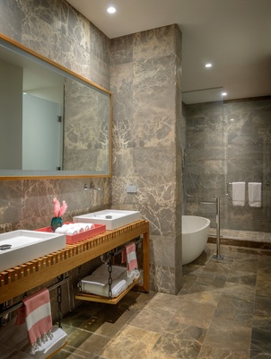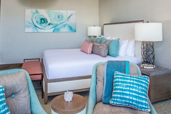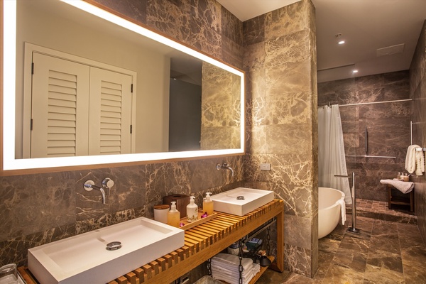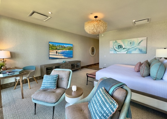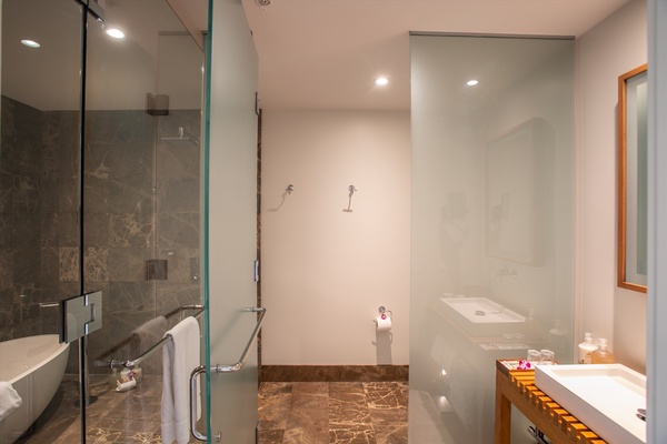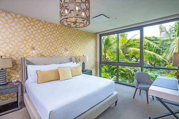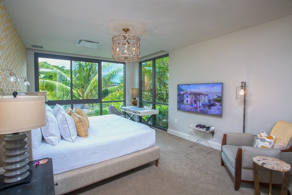 Extraordinary Pillow Top King Bed, reading chair, live green plant, dresser, motorized black-out shades, small desk and bedside tables. This bedroom has direct access through floor-to-ceiling glass sliding doors to the private patio. Ocean View with Pool and Garden Views. Air Conditioning and Remote Control Ceiling Fan. Full luxury private en-suite bath with deep soaking tub and separate glass shower, dual vanity sinks, private enclosed WC, make up mirror, scale, hair dryer, custom toiletries.