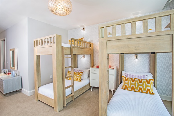Four Extra Long Twin Size Bunk Beds with pillow top mattresses, dresser and motorized black-out shades. Garden View. Private en-suite bath with deep soaking tub and glass shower, single vanity sink, private enclosed WC, make up mirror, scale, hair dryer and custom toiletries. Air Conditioning and Remote Control Ceiling Fans