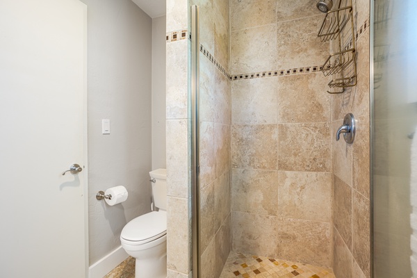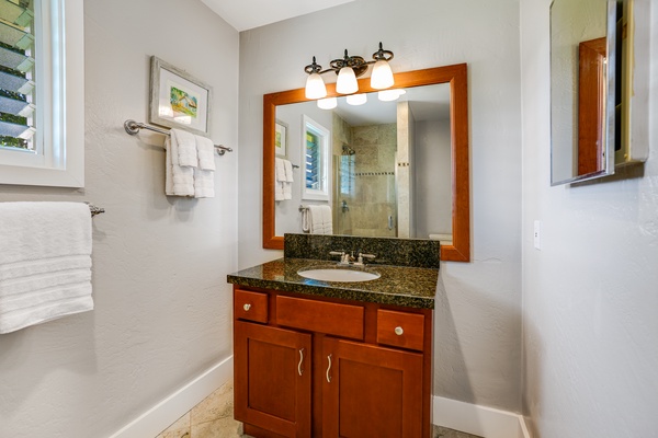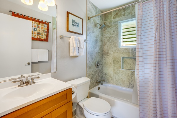 The shared bathroom across the guest bedroom, complete with all the essentials for a rejuvenating retreat.
