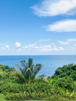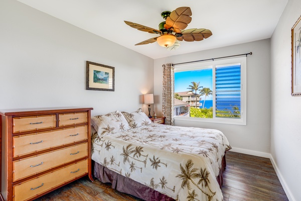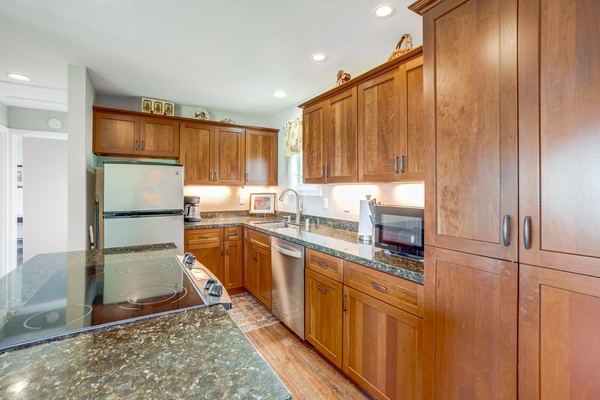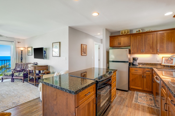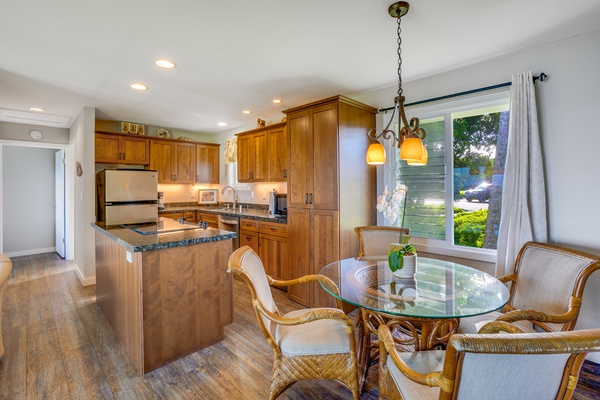 Featuring rich wooden cabinetry, sleek appliances, and a convenient island, it is perfectly equipped for crafting meals with the fresh flavors of the islands.