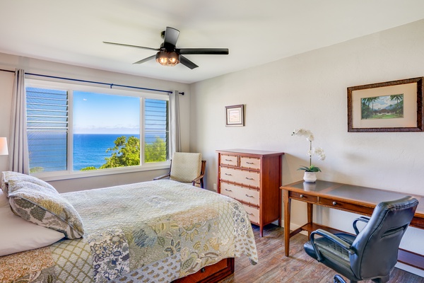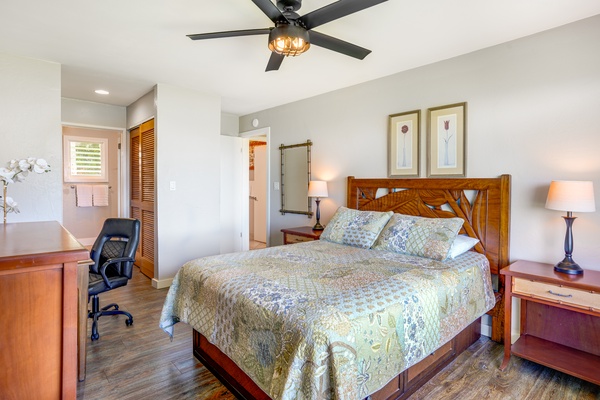 The primary suite, where a sanctuary awaits, complete with a comfortable California king bed, natural lighting and a dedicated home office.