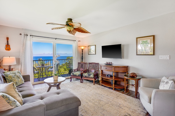 The living area, adorned with plush seating and a large ceiling fan seamlessly connects to the lanai.