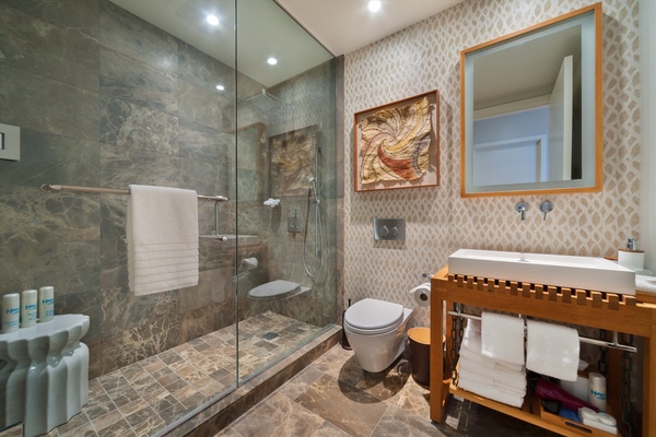 Private en-suite bath with deep soaking tub and glass shower, single vanity sink, private enclosed WC, make up mirror, scale, hair dryer and custom toiletries.