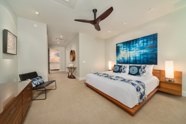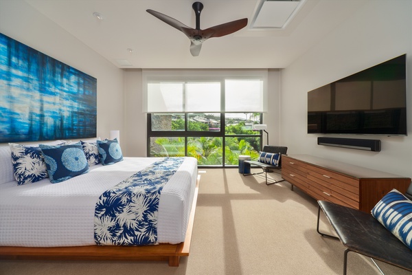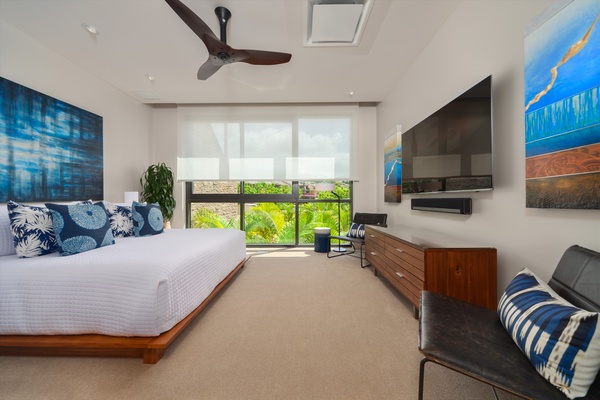 Extraordinary Pillow Top California King Bed, reading chair, live green plant, dresser, motorized black-out shades, small desk and bedside tables. This bedroom has direct access through floor-to-ceiling glass sliding doors to the private patio.