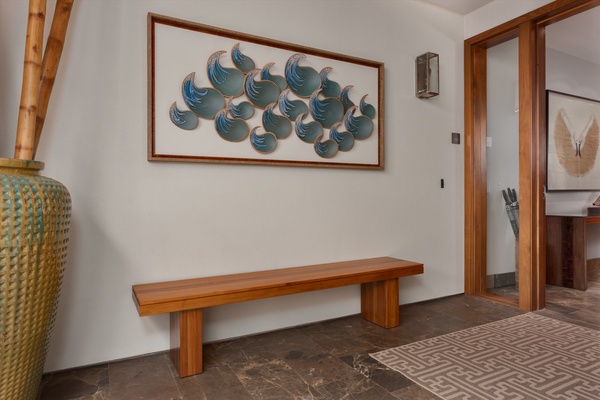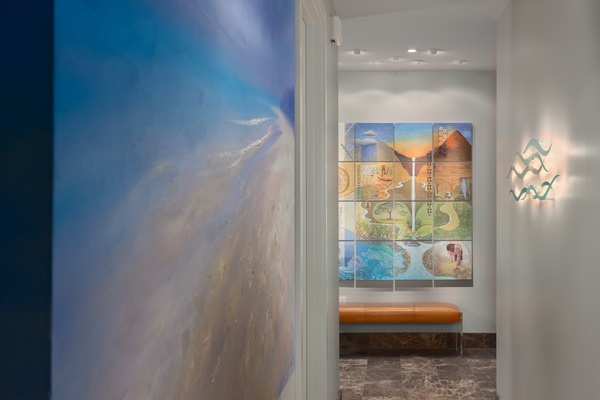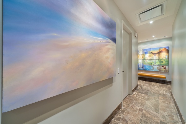 SeaSpirit is surrounded by a spectrum of colors reflecting the spirit of the sea, sky and Hawaii. Rich patterned browns, aqua, turquoise, teal and touches of golden sunset yellow are accented by real wood dressers, desks and bed frames. Original art on display at SeaSpirit are accented with an extended lighting system to enhance each piece.