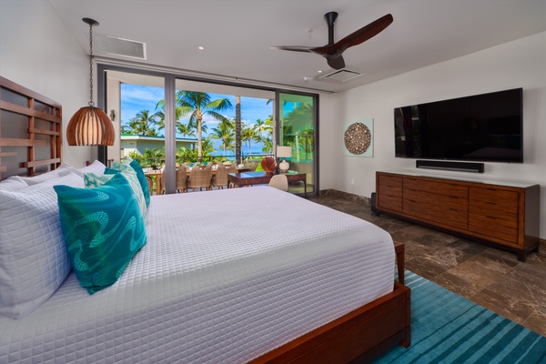 This bedroom has direct access through floor-to-ceiling glass sliding doors to the private patio.