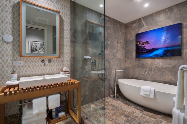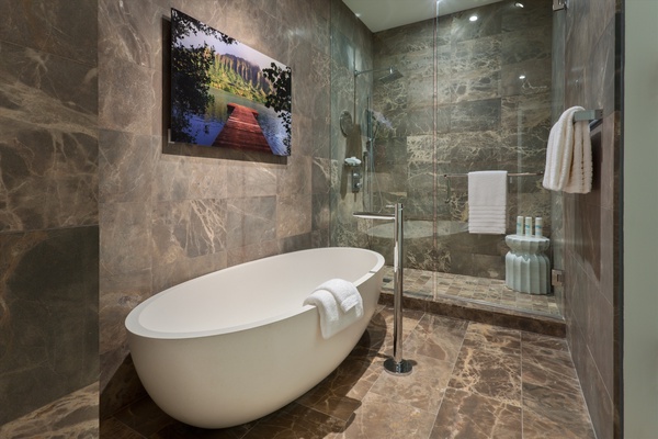 Full luxury private en-suite bath with deep soaking tub and separate glass shower, dual vanity sinks, private enclosed WC, make up mirror, scale, hair dryer, custom toiletries.