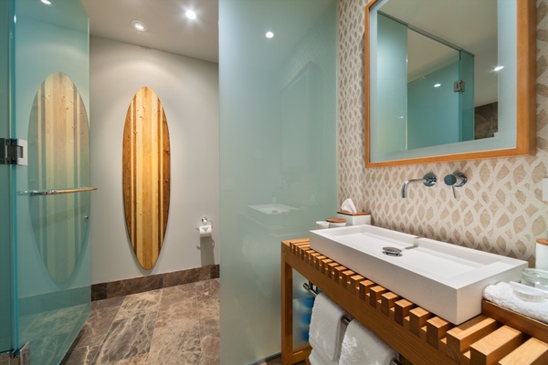 The 3 generously sized bedroom suites can sleep up to 8 guests and have a California King bed in the ocean view Master, an Eastern King bed in the 2nd bedroom, and 2 Queen beds in the 3rd bedroom. SeaSpirit has 3 full en-suite bathrooms plus a powder room full bath with shower.