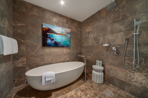 Plush pillow top mattresses, down pillows, down comforters and high thread count all-cotton bedding will tempt you to stay in bed all day. Extra pillows and blankets are pre-stocked in the closets. The bathrooms are loaded with thick soft all-cotton towels, hair dryer, make-up mirror, bathrobes, and a bath scale. Tropical theme toiletries are offered in 8 ounce size bottles - an eco-friendly gesture.