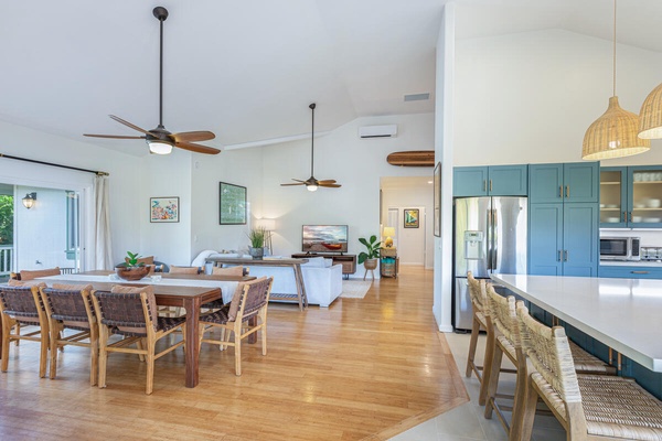 Seamless flow from living to dining to kitchen.