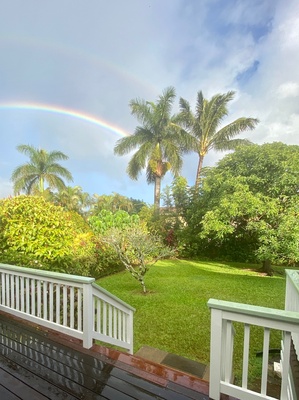 Tropical garden view framed by a rainbow.