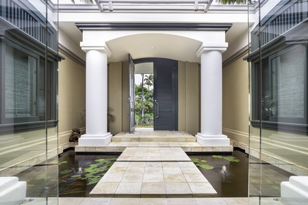 A grand entrance over a tranquil koi pond sets the tone for this serene island retreat.