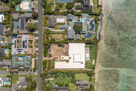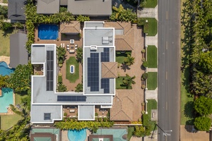 Overhead view showcasing the property’s layout with lush landscaping, outdoor living spaces, and modern design.