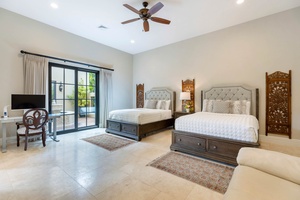 Spacious bedroom with two beds, a ceiling fan, and patio access for ultimate comfort.