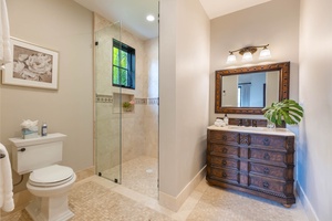 Modern bathroom with a glass walk-in shower, wooden vanity, and stylish finishes.