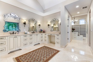 Stunning en-suite bathroom with dual vanities, intricate light fixtures, and a spacious layout.