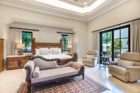 Sophisticated primary suite with luxurious furnishings, tray ceilings, and access to a private patio.