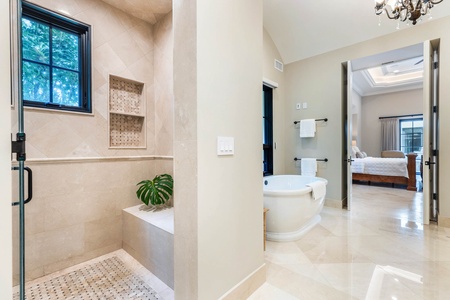 Bright bathroom with a walk-in shower, soaking tub, and serene design elements.