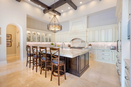 Spacious kitchen with a large center island, bar seating, and elegant light fixtures for entertaining and meal prep.